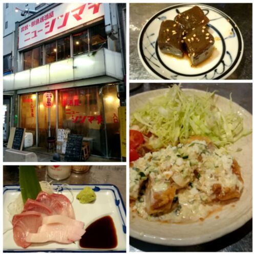 ニューシンマチ 年に一度の休日出勤の一人おつかれさん会。かれこれ3年ぶりくらいじゃないかと思うけど、5時半開店で6時にはほぼ満席。繁盛しとるわ。 タルタルチキン南蛮と寒ブリ造り。コンニャクはオマケ。後から注文した他のテーブルに持って行かれそうだ…