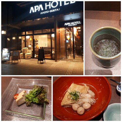 アパホテルの1階のおでんの店。観光客むけらしい、いかにも京風なあっさり味だけど、バランスはいい。つきだし(右上)はおでんだしともずく、右下はみそ漬けチーズ豆富。 www.apahotel.com