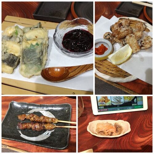 ややごぶさた。 左上は新メニューのクリームチーズの磯辺揚げ。ジャムが添えられている。牛モツの天ぷら、博多皮焼き、お通し(明太子食べ比べ休止中)。