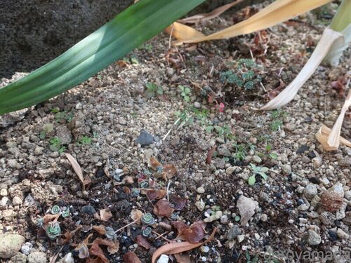 コモチレンゲの切り詰め追加 保護マツバギクの土追加 保護パリダムを全部地植えへ 記録 コモチレンゲの切り詰め追加 昨日気がついた件、残ったやつも切り詰めてみた。左上の株。